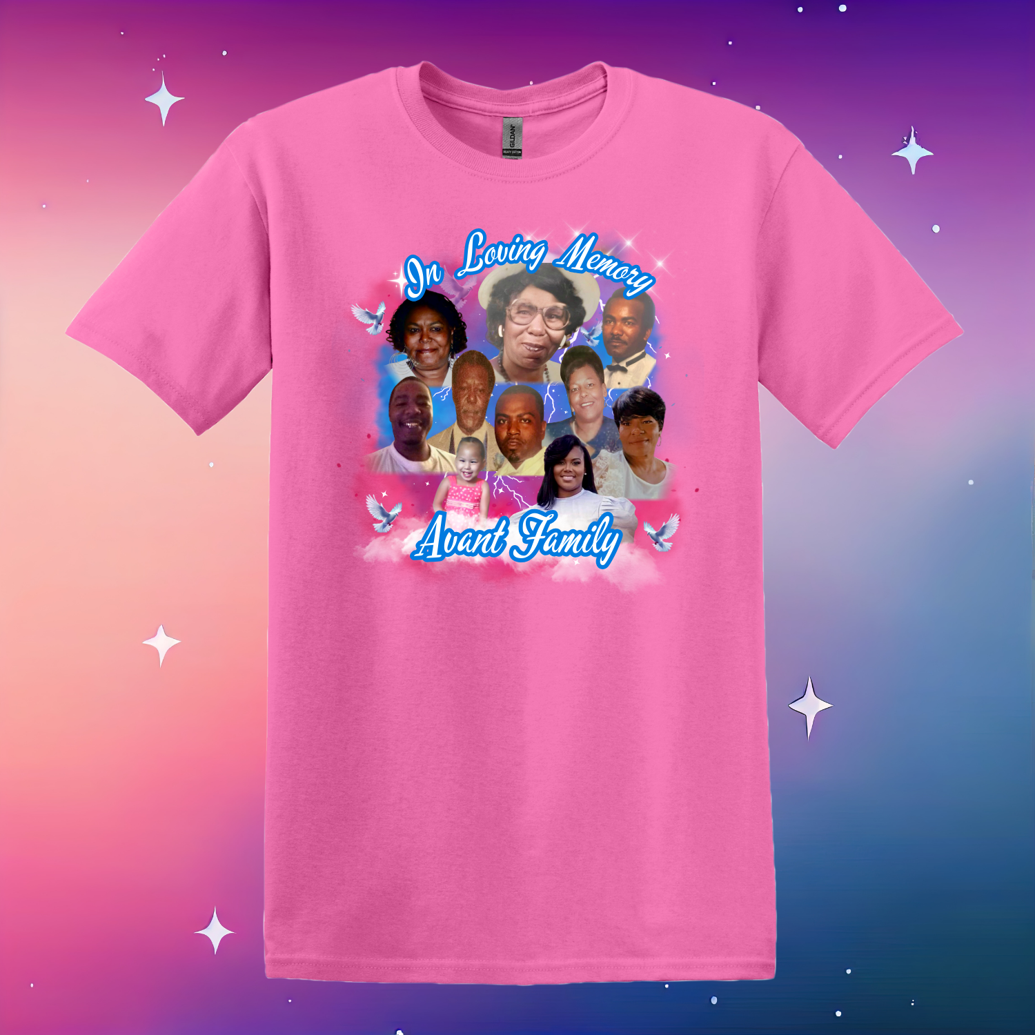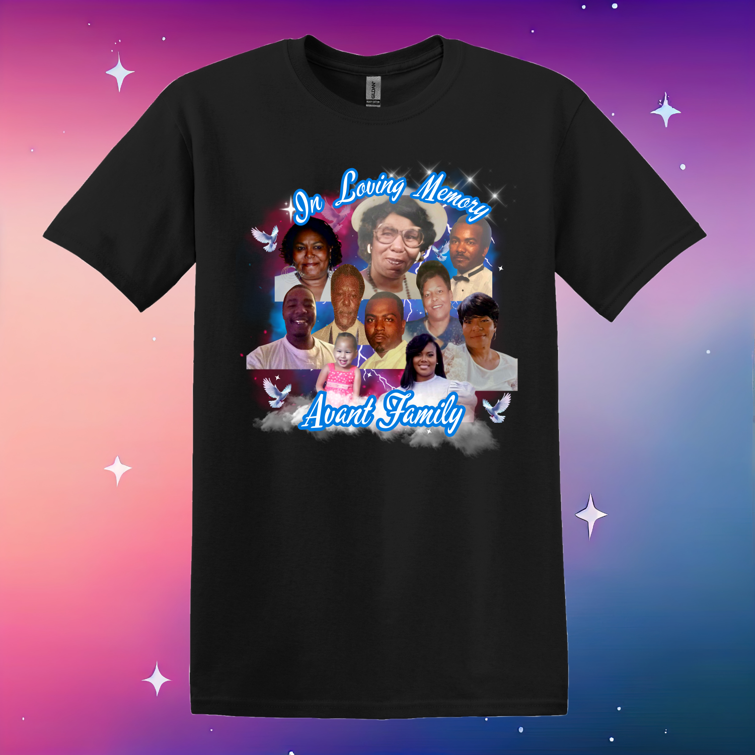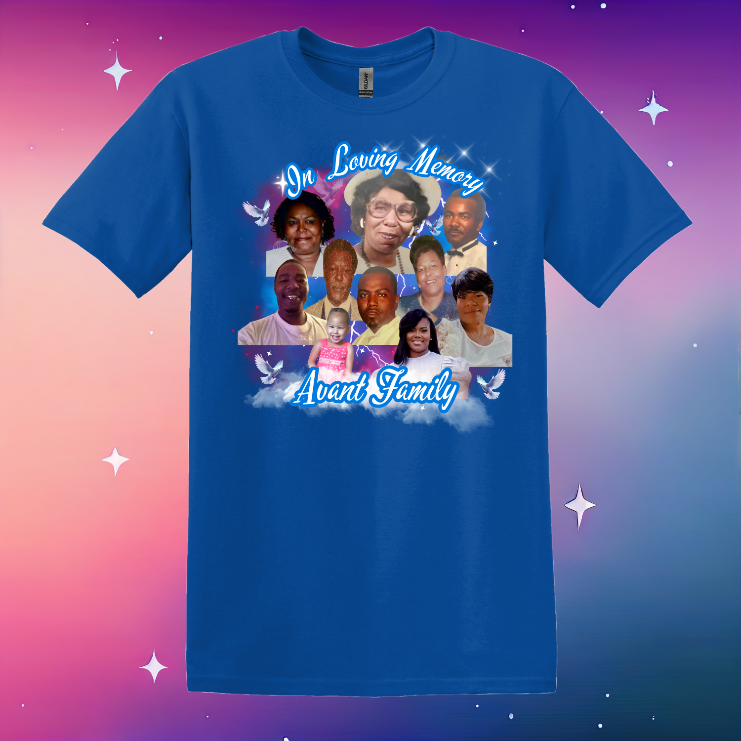 This design can be customized to your liking. Message Marian at 901-492-1380 the design color, apparel color, and pictures you'd like to include on the shirt.